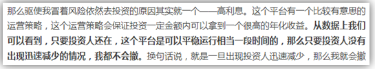 用这一句话来形容现在绝大部分人的心态,我想是再合适不过的。曾在某行业网站论坛上看到一篇帖子,一位投资人以他所投资的平台为例,从数据出发介绍投资心得。最后,得出的结论让人大跌眼镜,该平台问题不少,但这位投资人还是选择继续投。对自己这种做法,他这样说: