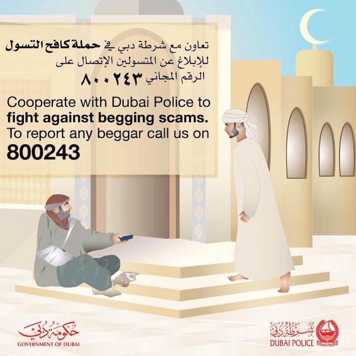 最近几年,迪拜警方年年都会发起打击乞讨的行动,尤其是在斋月期间。从2009年至今,迪拜警方已经逮捕了5559名乞讨者,其中4486人是男性,1073人是女性。