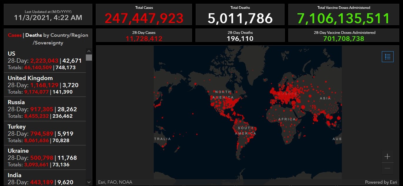 据约翰·霍普金斯大学的疫情追踪数据,截至北京时间11月3日上午8点,全球累计确诊新冠肺炎病例247447923例,累计死亡5011786例,接种疫苗超71.0亿剂次。
