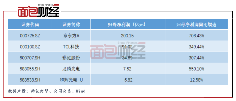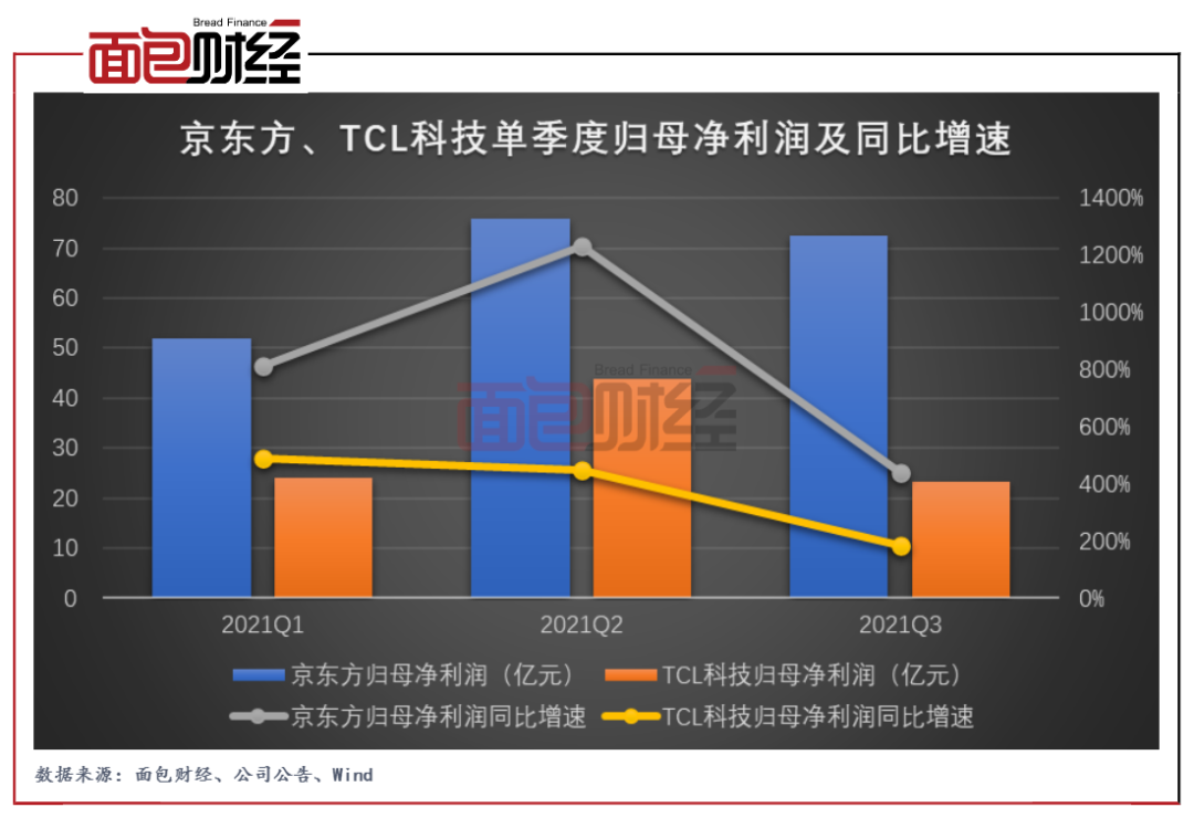 公告显示,京东方今年前三季度实现归母净利润200亿元,同比增长7倍;TCL科技前三季度实现归母净利润91亿元,同比增长349.44%。