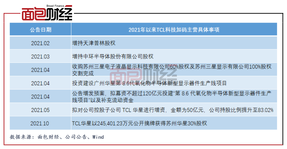 与出售广州金服、剥离地产业务相对应的是,TCL科技2021年以来持续加码主业。投建第8.6代氧化物半导体新型显示器件生产线项目(以下简称“t9项目”)、增资TCL华星、增持中环半导体与天津普林等。