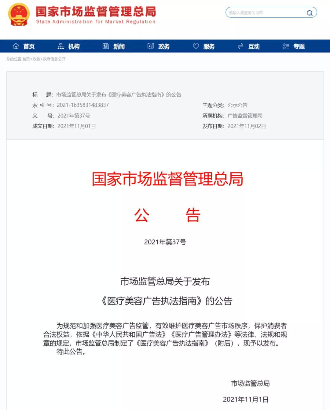 11月2日,国家市场监督管理总局发布了《医疗美容广告执法指南》(以下简称《指南》)。