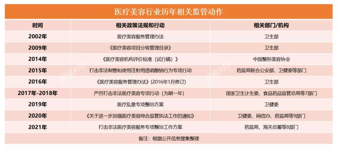 例如,5月28日,国家卫健委等八部门定于2021年6月-12月在全国范围内开展打击非法医疗美容服务专项整治工作;6月9日,中国互联网金融协会发布关于规范医疗美容相关金融产品和金融服务的倡议;7月30日,国家卫健委发布通知,禁止医美圈盛行的“小腿神经离断瘦腿手术”应用于临床;8月,“医美贷”被封杀。