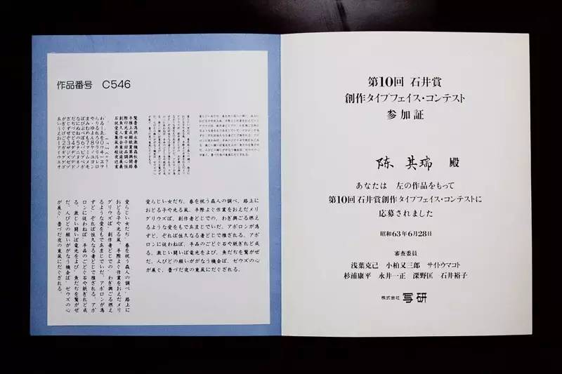 ▲ 陈老1985年,42岁参加日本森泽字体设计比赛,作品为仿宋笔形的宋体。