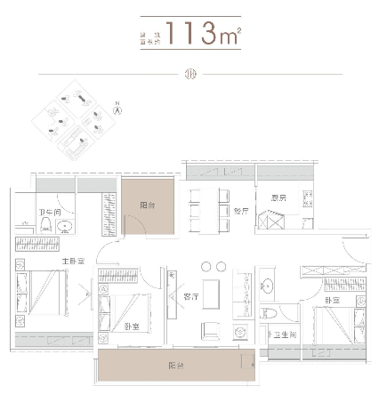 比如113㎡的四房两卫,阳台的长度约6.5m,增加了采光度。