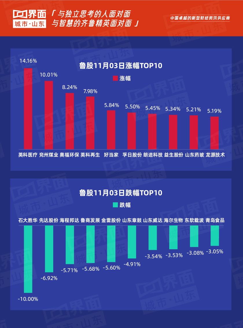 11月3日,山东162只股上涨,91只股下跌,3只股持平。总市值过千亿的有万华化学(600309)、海尔智家(600690)、青岛啤酒(600600)、潍柴动力(000338)、歌尔股份(002241)、中航沈飞(600760)、兖州煤业(600188)共7家,500亿-1000亿的共有7家,分别是、华熙生物(688363)、中泰证券(600918)、山东黄金(600547)、华鲁恒升(600426)、 联泓新科(003022)、 石大胜华(603026)、南山铝业(600219),玲珑轮胎(601966),截至收盘个股股价最高为石大胜华(603026),收于198.89元;最低为 *ST东洋(002086),收于1.75元。