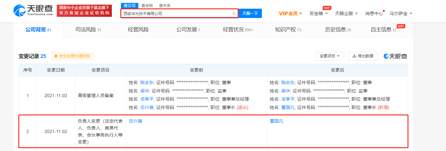 据天眼查APP显示,近日,西安华为技术有限公司、杭州华为企业通信技术有限公司接连发生工商变更,法定代表人均由田兴普变更为童国凡。工商信息显示,西安华为技术有限公司、杭州华为企业通信技术有限公司均成立于2008年,均由华为技术有限公司100%持股。