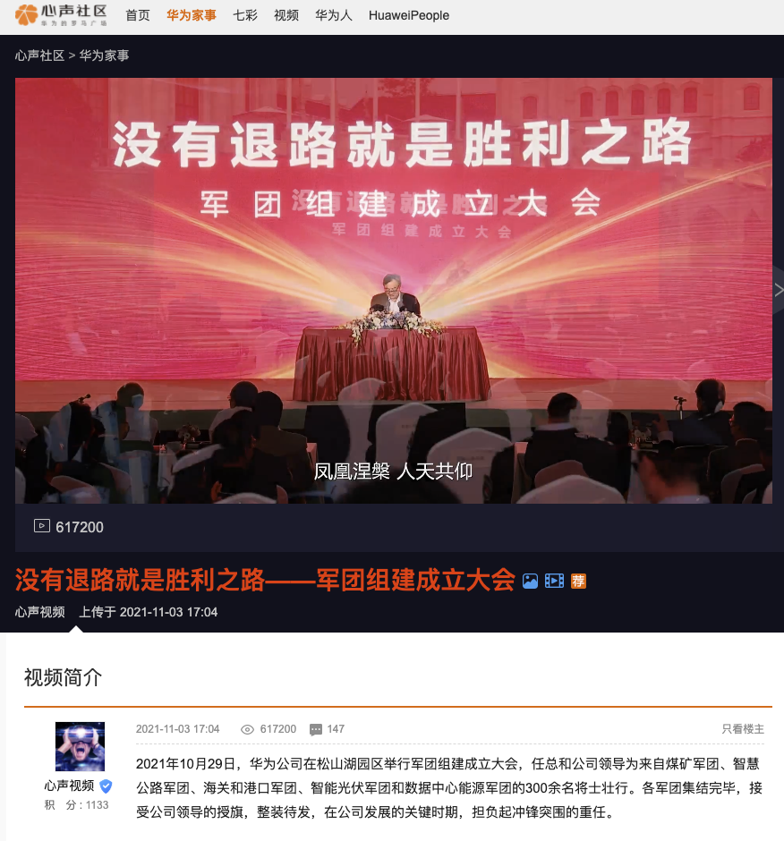 11月3日下午,华为心声社区上线了一段视频,内容显示,2021年10月29日,华为公司在松山湖园区举行军团组建成立大会。据证券时报此前报道,华为日前发文正式成立海关和港口、智慧公路、数据中心能源和智能光伏四个军团组织,这也继今年4月首次成立煤矿军团后,华为再次组建军团组织,目前该组织和华为三大业务运营商BG、企业BG、消费BG等属于同一个级别,华为军团组织由华为创始人任正非亲自制定并督导。