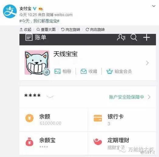于是,上午支付宝宣布:“今天,我们都是宝宝”,并霸气的把用户的名字都加了后缀“宝宝”,一度让宝宝们以为被盗号。据说从提出此创意到给所有用户加上宝宝昵称一共不到十六个小时,但大叔也觉得,涉及到安全问题,随便修改用户昵称的举动不太合适。