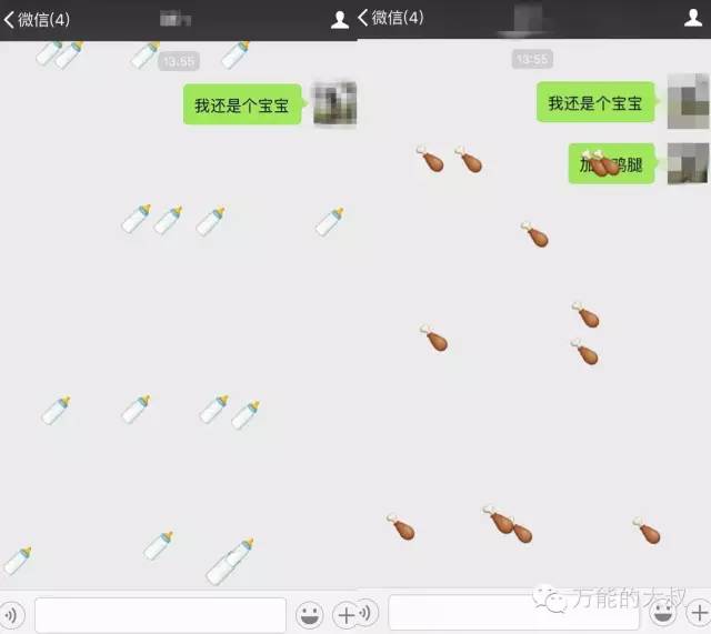 但总归是个全民欢庆的日子,各大品牌还是要出来庆祝一下的,比如微信输入“我还是个宝宝”、“加个鸡腿”便开始下奶瓶雨、鸡腿雨。