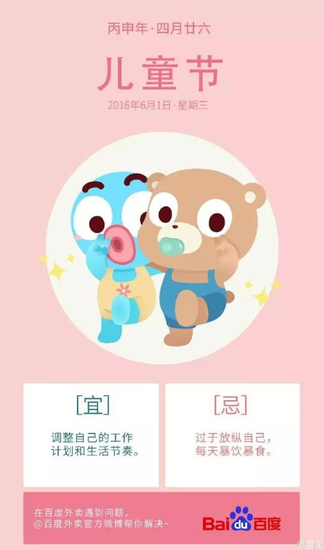 百度的官博为百度外卖吆喝:收不到儿童节礼物不如放纵自己一天,开吃!