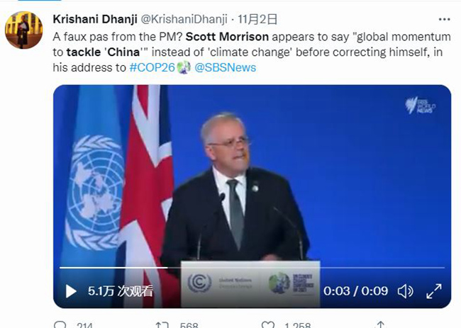 在演讲中,莫里森讲到全球推进应对气候变化时,误讲成“应对中国”,随后立刻改正。