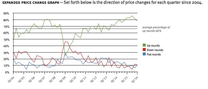 当人们对“未来高回报”坚信到狂热的程度时,不免出现怀疑,这正是人们所说的泡沫破灭的时候。从2015年以来,这种怀疑已经在出现,风险投资者在出资时往往讨价还价。根据硅谷Fenwick&West律所对2016年第一季度的148个总部在硅谷公司融资情况调查发现,这一季度融资的公司相比前一轮融资时价格上升的,即业界称之为上升轮的融资,占据78%;相比上一个季度(即2015年第四季度)的82%有所下降,平均价格的增幅(53%)略低于历史平均水平(56%)。