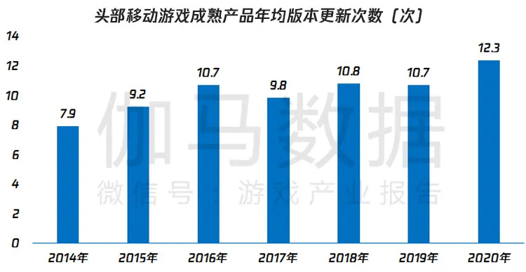 成熟产品也通过提供新鲜玩法的方式强化用户留存。这主要表现在成熟产品以更快的速度更新游戏内容,弥补初始内容的消耗,近年来头部移动游戏成熟产品的版本更新频率总体呈上升趋势。