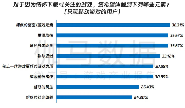 近年,市场中出现多款以情怀作为差异点吸引用户关注的移动游戏,范围涉及童年、生活方式等多种主题。据伽马数据调查,87.2%的用户明确表示会受到情怀游戏的吸引,也从侧面证明情怀打法的可行。关注情怀的移动游戏用户更加注重情怀在游戏中的复现,体验相似的元素是当前用户的主要诉求。