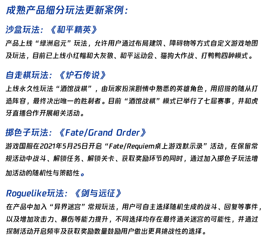 此外,部分产品也尝试将更多细分玩法融入产品主体游戏,例如将沙盒玩法、自走棋等玩法融入到产品中,助力成熟产品满足现有用户多元化的玩法需求,进而强化用户留存。