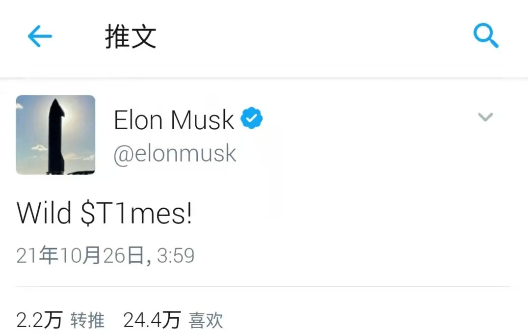 马斯克在Twitter上庆祝了这一里程碑时刻,一语双关写道:“Wild $T1mes!”。