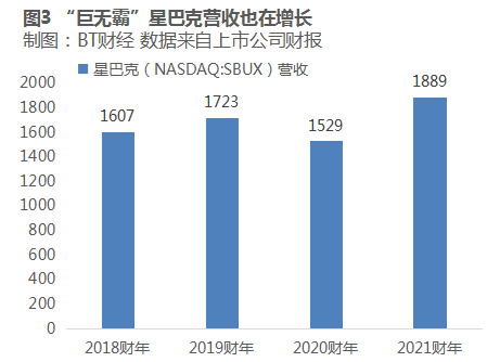 虽然奈雪的茶、瑞幸咖啡等后起之秀喜欢用高增长给资本讲故事,但同样不容忽视的是星巴克在全球范围内的增长速度也不慢,并体现出一定韧性。虽然2020财年因为疫情原因,星巴克营收同比收缩,但2021财年已经恢复至疫情前水平,算下来两年的复合增速仍超4%。