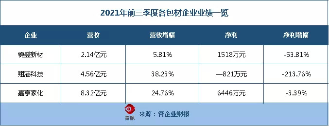 同为化妆品包材商的翔港科技,在今年第三季度的净利润也下降了99.48%,仅录得1.94万元。不仅如此,财报还显示,该公司在今年前三季度亏损了821万元,净利润同比下降213.76%。同期,嘉亨家化的净利润也同比下降了3.39%,为6446万元。