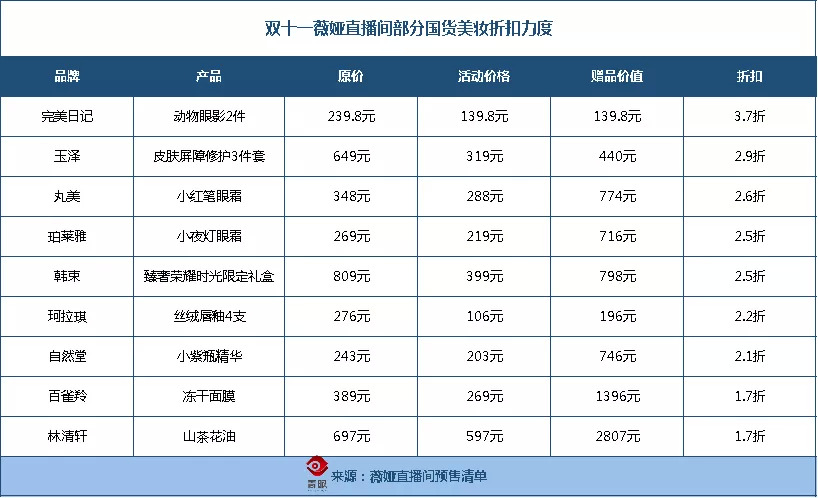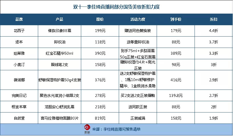根据今年双十一各品牌在李佳琦、薇娅直播间的优惠活动来看,国货品牌普遍给出了超低折扣。