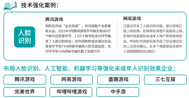 针对于未成年用户的相关行为特点,部分游戏企业也升级了自身的举措,例如引入人脸识别来防范成年用户信息被冒用,并取得了显著的成果。除人脸识别外,更多游戏企业也采用了人工智能、机器学习等技术进而强化未成年人识别效果。但值得注意的是,人脸识别技术等相关技术也可能会涉及隐私保护、数据安全与成本问题,游戏企业也在谨慎考虑用户隐私、信息安全与未成年人识别需求之间的平衡,逐步探索这项前沿技术的应用。