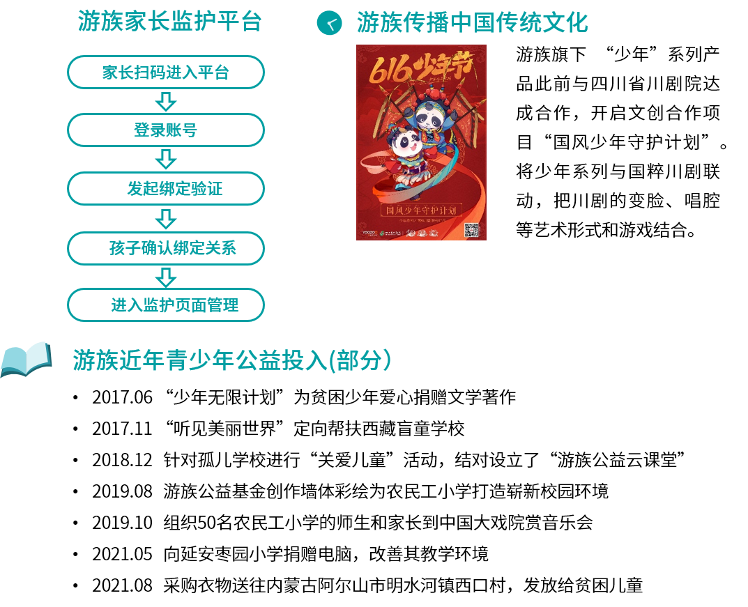 同时,游族网络的相关游戏将“少年”的正能量文化内核融入到产品创作和运营活动中,深度结合传统文化特点,进而引导青少年树立正确价值观,并后续通过与传统文化的联动帮助更多年轻人了解中华优秀文化。并且游族网络长期投入到青少年成长相关的公益活动中,公益活动范围涵盖全国,公益形式多元化,成为游戏企业中采用公益行动关爱青少年成长的代表。