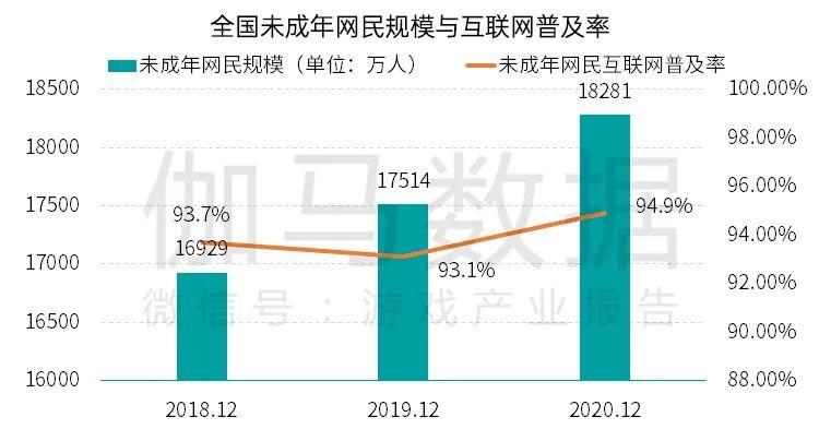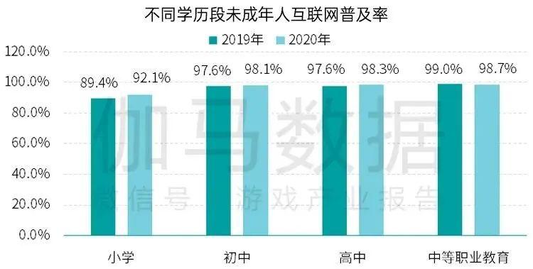 近年来,全国未成年网民规模持续增长,2020年已超过1.8亿,未成年网民互联网普及率达到94.9%,不同学历段的未成年人互联网普及率也呈现出较高的状态。这主要由于现阶段互联网已成为未成年人学习、娱乐、社交等行为的重要载体,特别是在新冠疫情期间,未成年人依托于互联网展开的线上活动更加频繁,助推了未成年网民规模的提升。