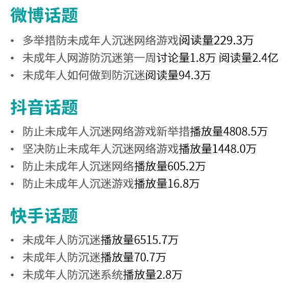 在防沉迷相关举措得到强化后,公众对于相关话题的关注度快速提升,社交平台、短视频平台与防沉迷相关的内容也得到了全体网民的广泛关注,微信指数、百度指数等反映网络关注度的数据提升数倍以上,话题关注度的提升也有助于帮助更多参与方了解相关环节。