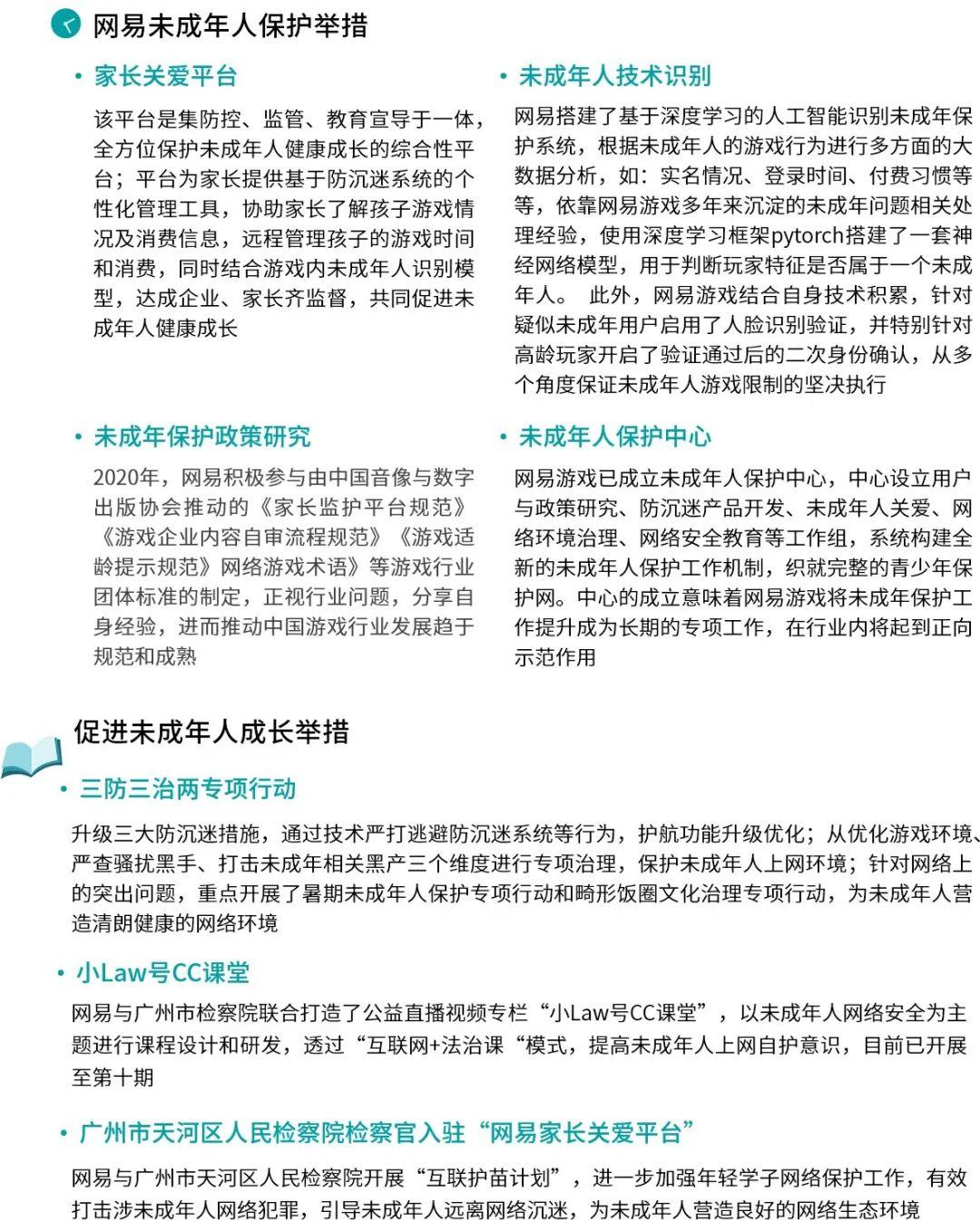 作为国内最早推行防沉迷体系的厂商之一,对于未成年人保护课题,网易游戏始终给与高度重视,并系统性构建未成年人保护工作机制。2019年网易升级未成年人保护举措,上线了“网易家长关爱平台”,协助家长了解孩子游戏情况及消费信息,远程管理孩子的游戏时间和消费;同时,网易游戏也在持续强化技术环节投入进而管控未成年人游戏,其中针对未成年人利用成年人身份信息绕过游戏防沉迷系统的情况,网易游戏基于人工智能的深度学习和大数据分析,搭建了未成年游戏用户判定系统,对于识别出来的未成年玩家进行相应的游戏行为限制,并结合自身技术积累,针对疑似未成年用户启用了人脸识别验证,进而保证未成年人游戏限制的坚决执行。此外,网易游戏积极牵头或参与行业相关政策的制定,配合有关部门共同推动中国游戏行业发展趋于规范和成熟。在落实游戏产业内未成年人保护举措的基础上,网易游戏也深度关注未成年人保护活动,例如积极助力未成年人保护知识科普,持续推进“三防三治两专项”行动,进一步升级未成年人保护措施,并开展了打击未成年人相关黑产、畸形饭圈文化治理等专项行动;旗下产品积极参与公益活动,涵盖知识科普、启蒙课程等多个领域。为确保未成年人保护工作的专业性及可持续性,网易游戏成立了未成年人保护中心,中心设立用户与政策研究、防沉迷产品开发、未成年人关爱等工作组,并将长期发挥作用。