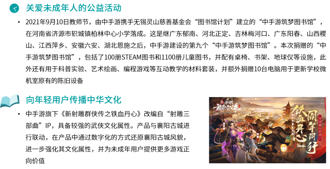 在未成年人保护领域,针对已经存在及潜在的未成年用户,中手游已在官网运营的游戏中设置实名认证及防沉迷系统,并通过游戏适龄提示等方式进行事前提示、通过家长监护工程体系等方式强化事后解决办法。以家长监护工程体系为例,中手游在官网设置家长投诉客服专线并提供全年无休的通话服务,还针对监护人举证未成年人过度消费存在的客观难度,制定相应的判定程序,通过监护人提供的申请材料分析、认定消费者是否为未成年用户,减轻监护人举证压力。同时,中手游针对未成年人的公益活动已持续多年,目前已在全国多个地区捐赠了“中手游筑梦图书馆”,进而帮助更多未成年人成长。此外,中手游也借助于旗下产品题材优势,传播中华文化,进而为年轻用户展示更多文化内容的正向价值。