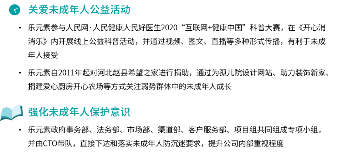 现阶段乐元素在中国运营的主力产品为消除类休闲游戏,这也是较多家长允许孩子自由进行娱乐的游戏类型。乐元素旗下主力产品《开心消消乐》的游戏画面以卡通风为主,极大程度地降低了未成年人接触血腥、暴力等画面的可能。此外,除落实防沉迷要求外,《开心消消乐》多年来采取的体力机制及付费模式也有利于防止未成年人沉迷游戏及过度消费,体力机制能自动限制用户的游戏时间,轻度的付费模式使得《开心消消乐》免费用户比例常年占据90%以上,且付费用户也以小额充值居多。游戏之外,乐元素也尝试通过其他方式降低未成年人接触不良信息的可能,如在相关游戏社区内对于涉及文字发布、评论、交流或者图像DIY的功能增加人工审核,减少违规内容展示。同时,乐元素也尝试通过举办公益活动、参与社会责任研讨等方式保护未成年人成长,并对人脸识别等新兴的未成年人监测方式保持关注。