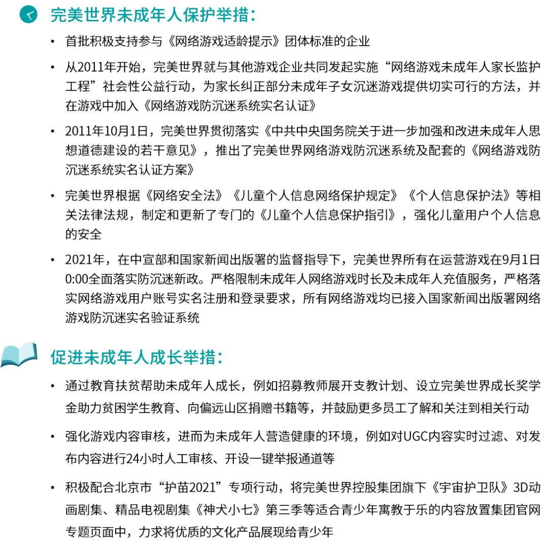 从2011年开始,完美世界与国内其他五家游戏企业共同发起了“网络游戏未成年人家长监护工程”社会性公益行动,并在游戏中加入《网络游戏防沉迷系统实名认证》,是国内最早多方位展开未成年人防沉迷工作的游戏企业之一。后续完美世界又参与了未成年人保护相关的多项工作内容,进一步落实防沉迷相关举措。除游戏防沉迷领域外,完美世界通过教育扶贫帮助未成年人成长,通过开展志愿者支教、奖学金资助、物资捐助方式提高偏远山区教育发展水平,并鼓励更多员工了解和关注未成年人保护行动。近年来,完美世界还采取与保利艺术博物馆牛、虎、猴、猪四件“兽首”、三星堆、中华五岳、敦煌文化、南京夫子庙、龙泉刀剑等合作的方式,将中国文化元素及内容融入到产品中,进而引导青少年学习传统文化,并树立正确的文化价值观。