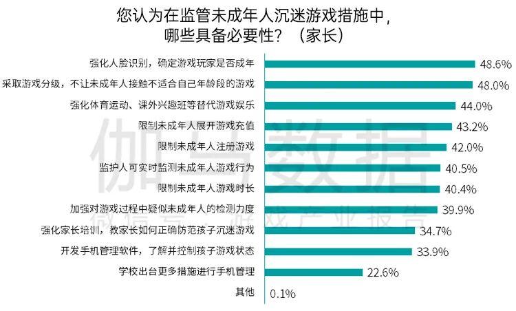伽马数据(微信号:游戏产业报告)研究显示:家长认为,在监管未成年人沉迷游戏措施中,多项举措非常必要,包括人脸识别、游戏分级、未成年人充值及时长限制等。
