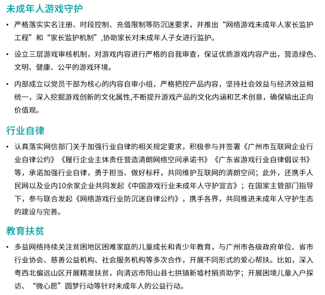 在未成年人保护领域,多益网络主要围绕未成年人游戏守护、行业自律、教育扶贫三方面进行切入。在未成年人游戏守护环节,多益网络旗下所有产品严格落实防沉迷要求,并主动协助家长管控未成年人游戏行为。同时,不断完善游戏内容自审制度,设立三层游戏审核机制,保证优质游戏内容产出,进而营造健康的游戏环境,避免影响未成年人的身心健康。此外,多益网络内部成立内容自审小组,确保游戏产品文化内涵和艺术创意的优质性,进而输出正向价值观。在行业自律层面,多益网络强化与社会各界力量的合作,共同推进未成年人守护生态的建设与完善,进而创造健康的网络游戏空间。在教育扶贫领域,多益网络关注更多贫困儿童的教育和生存状况,并借助于自身的资源帮助贫困儿童学习和成长。