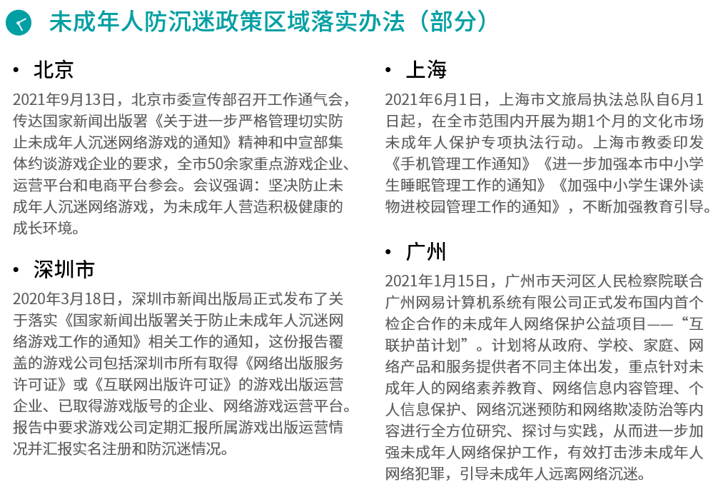 政策层面,我国已出台多项未成年人游戏防沉迷相关规定,而随着政策的迭代与发展,监管范围、监管深度也不断深入。监管范围方面,在相关政策的引导下网络游戏已先后加入健康游戏忠告、游戏时长限制、充值金额限制、游戏实名认证等功能模块,并引入家长监护工程减轻监护人监管负担;监管深度方面,针对未成年人游戏时长、充值金额等方面的限制力度逐步增强,而随着技术手段的发展,跨游戏、跨终端监管未成年人游戏状况也将成为现实。全国性政策之外,北京、上海、深圳、广州等多地已针对未成年人防沉迷出台相应的区域落实办法,强化属地企业、产品的政策执行力度。现阶段未成年人防沉迷已取得较为明显的效果,而随着人脸识别等先进技术的发展应用,未成年人防沉迷效果仍将持续增强。