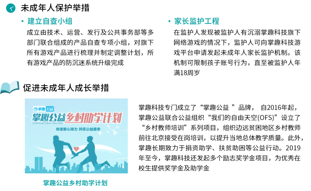 近年来,掌趣科技积极落实防沉迷相关工作,并成立了由技术、运营、发行及公共事务部等多部门联合组成的产品自查专项小组,严格审查旗下所有游戏产品,进而确保防沉迷系统的完善。同时,掌趣科技也积极开展家长监护工程,并为家长提供客服热线电话、游戏公众号和客服QQ等渠道供未成年人监护人投诉及反馈。除直接采取举措外,掌趣科技还成立了未成年用户监控小组,开展未成年人保护相关的讲座与培训,以强化公司内部未成年用户保护意识。此外,掌趣科技长期投入公益行动,发动社会力量共同积极探索更加高效的未成年人保护举措。在捐资助学的基础上,掌趣科技更与学校和学生深入探讨游戏在教育领域的应用价值,进而了解未成年人的游戏行为状况,并将相应经验运用到未成年人保护领域,更好的帮助未成年人健康成长。