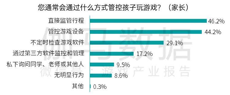 数据调查结果显示,九成以上家长会管控孩子的游戏时间,其中不足一成家长明令禁止孩子玩游戏,但孩子会偷偷玩。在管控方式上,直接监管行程和管控游戏设备成为超过四成家长的选择,进而限制未成年人的游戏时长。家长整体在管控孩子游戏行为上相对开明,但自身也有着明确的管控举措。
