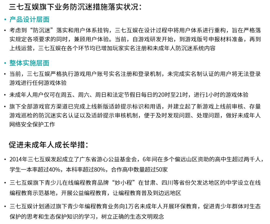 据数据统计,三七互娱现阶段旗下百余款游戏产品已完成防沉迷系统的升级调整,其中约八成产品已禁止未成年人登录注册,旗下37网游平台、37手游平台也升级了未成年保护措施。同时,三七互娱也将未成年人保护层面的举措落实到研发、版号申报、运营等各个环节,进而确保自身产品能全面兼顾未成年人保护需求。在持续优化防沉迷工作的同时,三七互娱也进一步关注未成年人成长,并实施多种举措,例如通过频繁的公益行为帮助未成年人更好接受教育、展开科普性活动帮助未成年人树立正确的价值观念。此外,三七互娱还将成立专项工作小组,立足于未成年人保护展开网络信息治理,持续监控和处置违法违规行为及负面网络信息,营造健康的网络环境。未来,三七互娱将持续与有关部门、家庭、学校等参与方强化合作,共同推动未成年人保护工作。