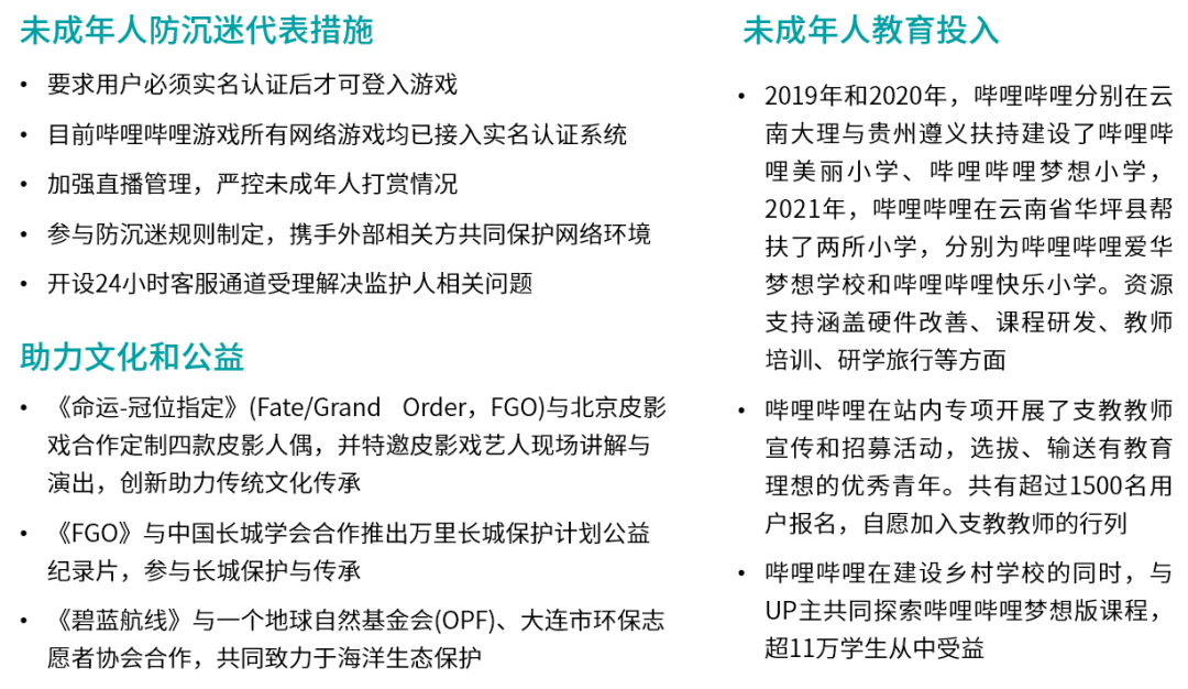 哔哩哔哩旗下平台内容与游戏产品已全面展开未成年人保护举措,平台侧已围绕视频、直播等内容环节对未成年人娱乐时长、打赏等进行限制。游戏产品主要从限制和引导两方面积极推进防沉迷工作。在限制层面,哔哩哔哩游戏严格限制未成年人的游戏时间,旗下所有网络游戏均已接入实名认证系统,结合哔哩哔哩游戏健康系统从游戏时长和充值金额两方面对未成年玩家进行限制,共同保护未成年人的健康。此外,哔哩哔哩游戏计划加入“网络游戏未成年人家长监护工程”,为监护人提供妥善监管未成年用户的渠道。在引导层面,哔哩哔哩游戏不断强化平台内各类游戏的内容审核与管理,抵制低俗内容与不良文化,持续助力文化和公益事业,正向关注和引导未成年人的生活方式和心理状态。此外,哔哩哔哩也在全方位运用自身的资源和影响力助力青少年成长,并强化未成年人教育投入,涵盖捐赠、支教、网课等多个领域,作为覆盖数亿用户的平台型企业,其持续开展的举措有助于提升未成年人保护的关注度。