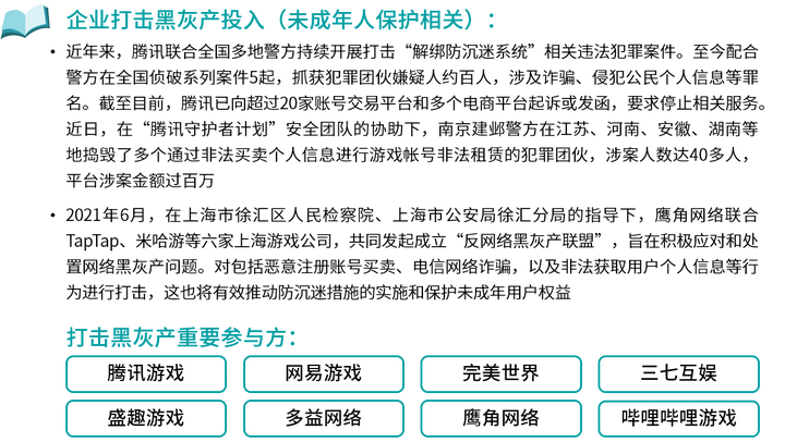 在未成年人保护领域,多个游戏企业表态深度参与到相关工作中,并直接响应主管部门发起的政策与号召,包括彻底落实防沉迷措施、明确游戏分级、限制未成年人充值等相应要求。在实际执行中,部分企业持续运用自身资源,并借助多种方式主动投入到未成年人保护相关的工作中,例如完善未成年人游戏识别技术与体系、构建并持续升级自身的家长监护工程、进行公益活动帮助未成年人成长、开发功能性游戏促进未成年人科普教育、联合相关部门产出未成年人保护相关内容等。