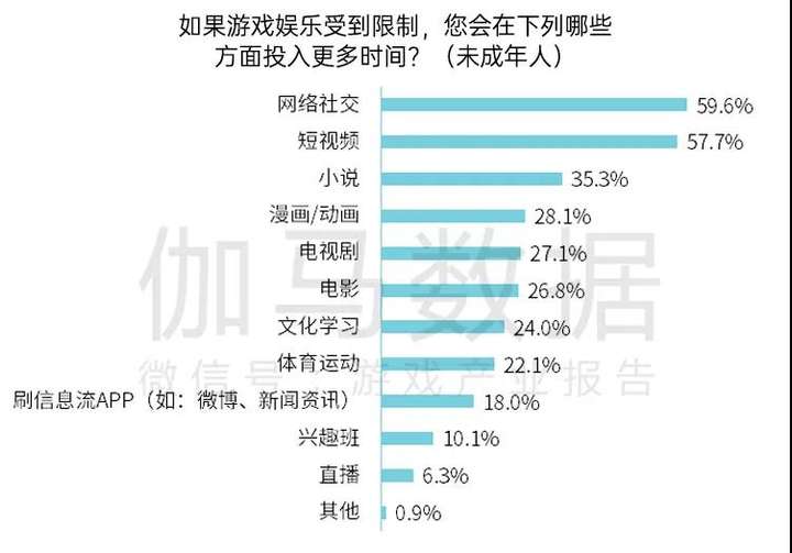伽马数据最新的研究显示:从未成年网民经常从事的网络娱乐行为可以看出,在线音乐、网络社交、短视频、动漫和游戏,位列使用频度前五。