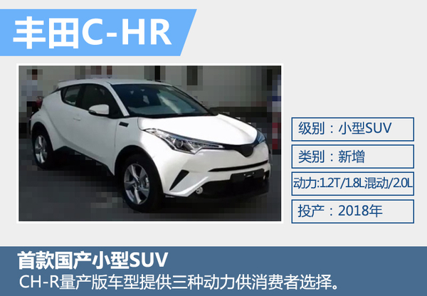 根据丰田公布的消息,全新小型SUV C-HR车身尺寸为4,350*1,795*1,555/1,565毫米,轴距为2,640毫米。动力方面,丰田C-HR将提供三种动力供消费者选择,分别为1.2T涡轮增压发动机、1.8升混合动力和2.0升自然吸气发动机。