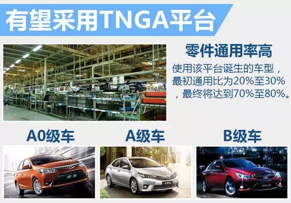 TNGA(Toyota New Global Architecture)平台集成了A0级、A级以及B级(前置前驱)车型,可以实现多级别车型零部件通用,在提升车辆安全性、轻量化程度的同时降低生产成本。TNGA平台支持传统燃油车和混合动力系统车型,并且通过轻量化等设计能将能耗降低25%。在能耗减低的同时,新车动力输出与操控性也将有一定进步,丰田最具代表性的混合动力车型-普锐斯便诞生于TNGA平台。