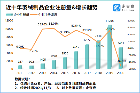 企查查数据显示,我国现存羽绒制品相关企业4.99万家。近十年,我国羽绒制品企业注册量整体呈上升趋势。2018年新增羽绒制品7313家,同比增长16.50%。2019年新增1.11万家,同比增长51.17%。2020年新增5451家,同比减少50.69%。