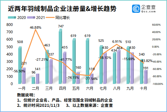 企查查数据显示,2021年前10月,我国新增羽绒制品企业2948家,同比减少64.89%。最近的10月新增191家,同比减少43.82%。9月新增430家,同比减少15.69%。今年8月,我国新增羽绒制品相关企业464家,同比增长6.91%,是今年前10月中新增最多的月份。