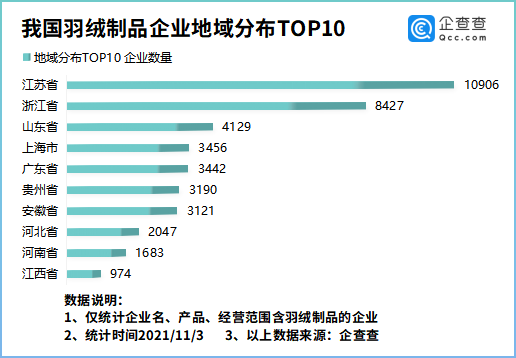 企查查数据显示,从区域分布来看,江苏以1.09万家羽绒制品企业排名第一,浙江省、山东省分别有8427家、4129家羽绒制品相关企业,排在第二、三名。此后依次为上海市、广东省、贵州省等。