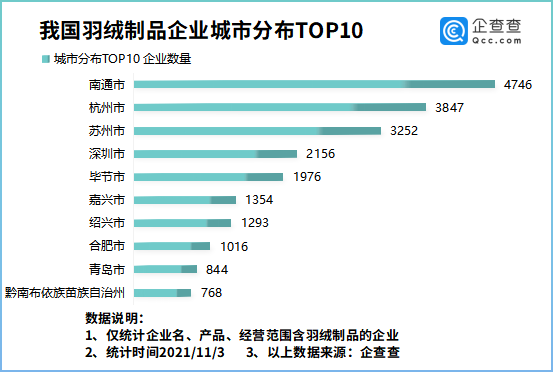 企查查数据显示,从城市分布来看,南通位居榜首,拥有4746家羽绒制品企业。杭州市、苏州市分别有羽绒制品相关企业3847家、3252家,位居前三。此后依次为深圳市、毕节市、嘉兴市等。