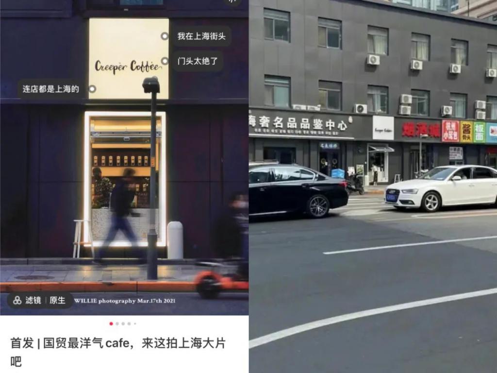 左图为网友分享的国贸某家咖啡馆,乍一看真像来到了上海街头,有复古时尚的那味了。再看右边大众点评中一张商家图片,是不是觉得哪里不太对。