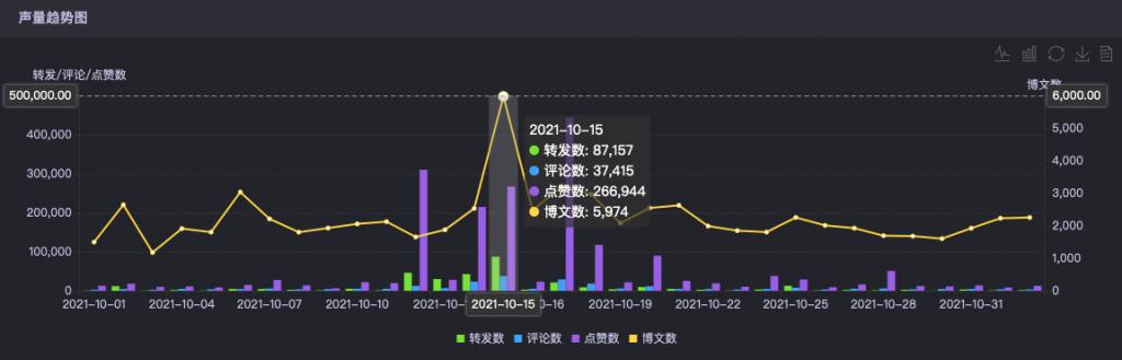 根据时趣洞察引擎数据看到,相关话题在微博上的讨论声量,在 10 月 15 日达到了峰值,超过了近一个月内其他时间段的平台热度。