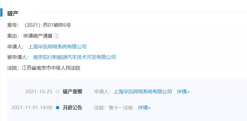 根据企查查数据显示,拜腾汽车母公司南京知行新能源在本月初新增一条开庭公告,案件被标注为申请破产清算,按照案件详情可知,上诉方为上海华讯网络系统有限公司(以下称为“上海华讯”),被上诉方正是南京知行新能源。